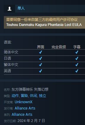 《东方弹幕神乐 失落幻想》是首次获得东方Project官方认证的手机游戏《东方弹幕神乐》重制而来的单机版音乐游戏。