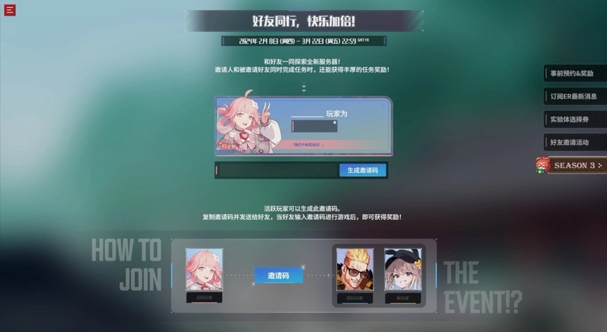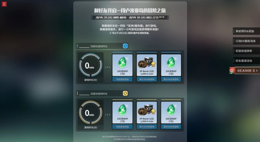 4. 好友同行,快乐加倍:2月8日~3月22日,在事前预约页面邀请好友一起探索全新服务器,邀请人和被邀请人同时完成任务,即可获得包含A-Coin和NP在内的丰厚任务奖励。