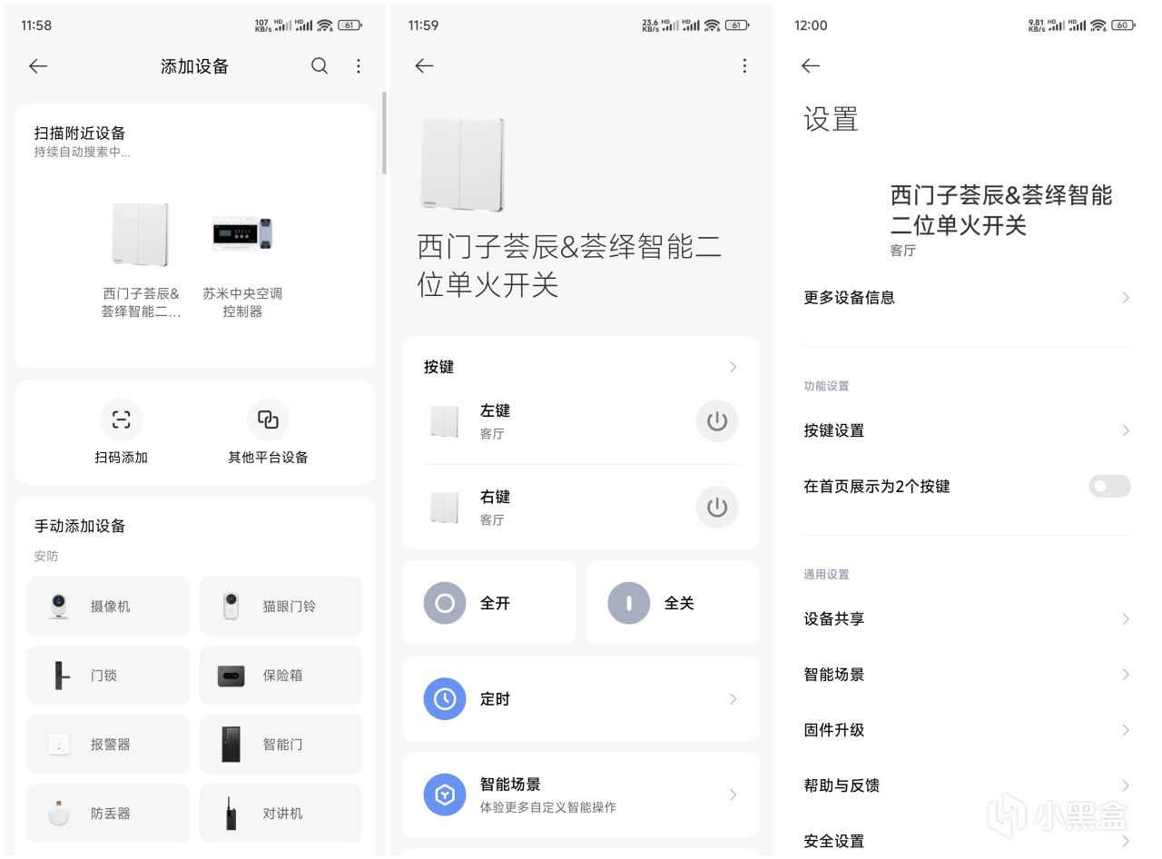 这款开关支持接入西门子智家应用、天猫精灵或者米家平台。安装好后,长按左键10秒,开关进入配网模式,打开米家APP,按照添加设备提示添加设备即可。在APP管理界面有开关外形和名称,通过界面可以控制开关左/右键,也可以一键让左右键全开或者全关,支持定时开关和智能场景联动。