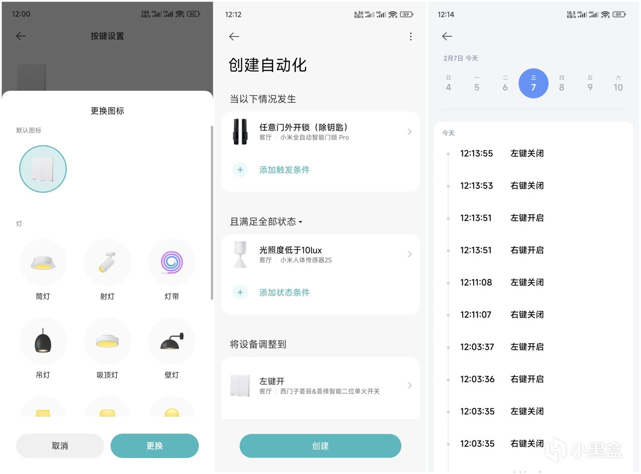点击右上角3个点,进入设置界面,可以对开关的按键图标等进行设置,根据家中智能设备添加各种自动化智能场景,通过APP还可以查看设备日志。小编通过门窗传感器和光线传感器,设置下班回家开门,自动开启玄关灯,入户关门后,自动光比灯,同时开启客厅灯。真的方便很多,到家开门不用再摸黑摸墙上的开关了。用户可以根据自己的生活习惯和需求,设置不同的场景模式,如观影模式、会客模式、睡眠模式等,一键切换,轻松实现家居氛围的变换。