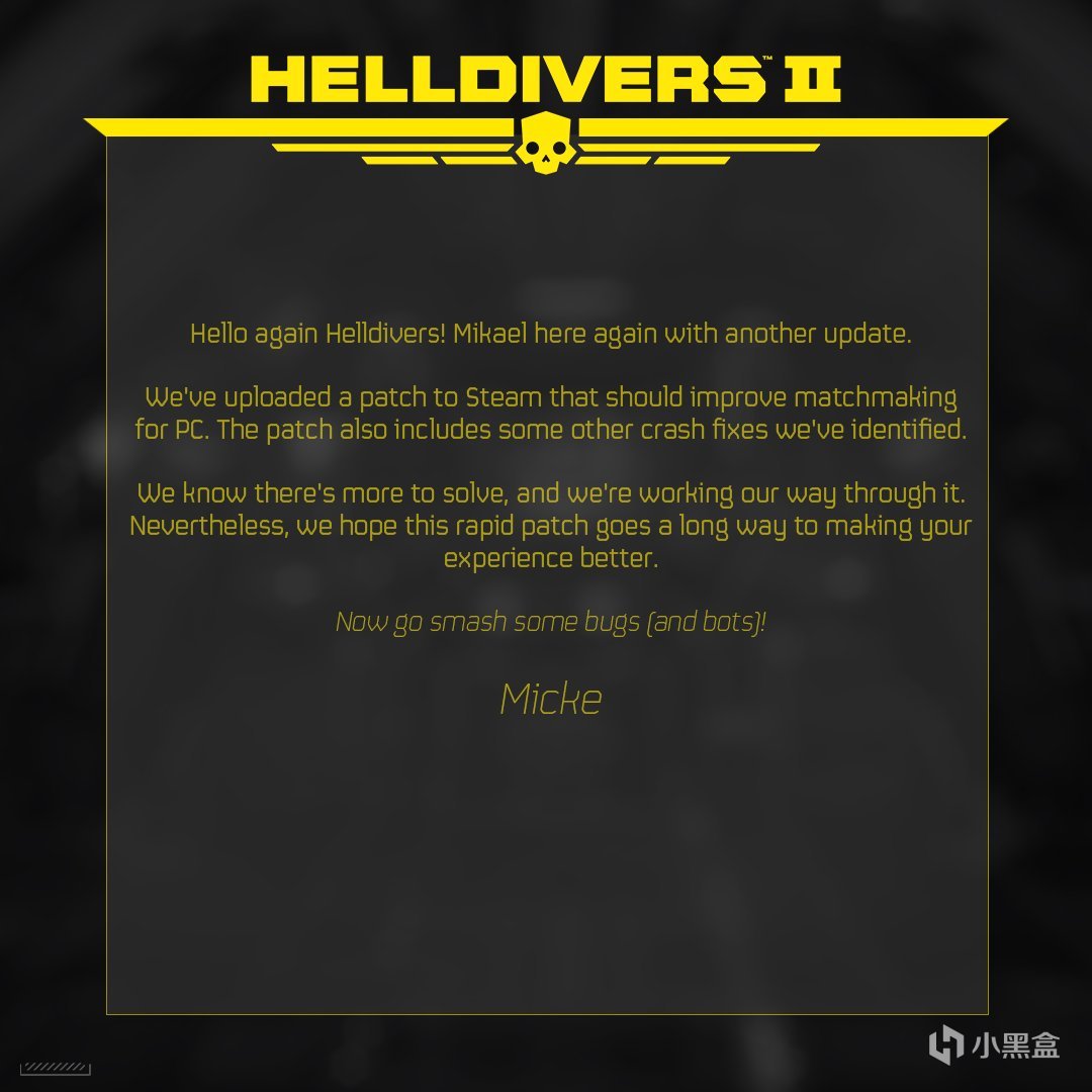 《絕地潛兵2》於昨天下午17點正式發售,大批玩家在解鎖的第一時間就下載遊戲等待進去遊玩,但等玩家上手進行體驗後發現,遊戲內存在不少的問題。根據玩家們的反饋,遊戲的閃退問題非常嚴重,匹配也常會出現崩潰的情況,另外遊戲的聯網也有問題,一直失去連接無法進入遊戲大廳導致無法進行多人聯機模式。好在官方今天也是立刻推出了補丁進行修復,具體內容爲: