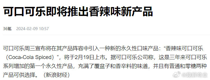 据报道,可口可乐即将变得更加辣。该公司周三宣布将在其产品阵容中引入一种新的永久性口味产品:香辣味可口可乐(Coca-Cola Spiced),将于2月19日上市。据可口可乐公司称,这是三年来可口可乐系列增加的第一个永久性产品,充满了覆盆子和香辛料的味道,并且有普通和零糖两种产品可供选择。