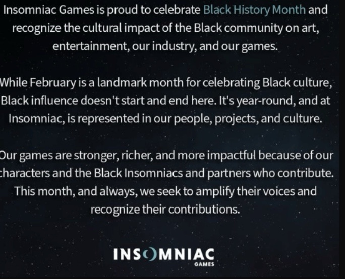 今日,Insomniac Games庆祝“黑人历史月”,感谢黑人对艺术、娱乐和游戏产业的文化影响。Insomniac Games荣幸庆祝黑人历史月,承认黑人对艺术、娱乐、游戏行业和公司文化的影响。他们的贡献使我们的游戏更加强大、丰富、有影响力。我们一直致力于放大黑人员工和合作伙伴的声音,认可他们的贡献,不仅在本月,而且在全年各个时刻。
