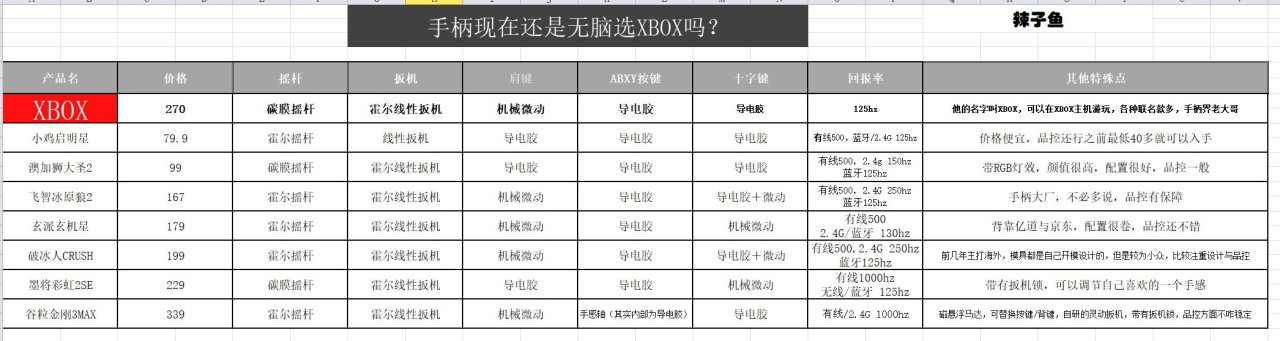 ~那我今天就把XBOX与其差不多一个价格的手柄相关参数整个表格呗,打打这位老哥脸呗,xbox再怎样,也不能让你这样吹啊,这老哥真是傲娇到精神失常了。不说500的,一两百的都差不多碾压了