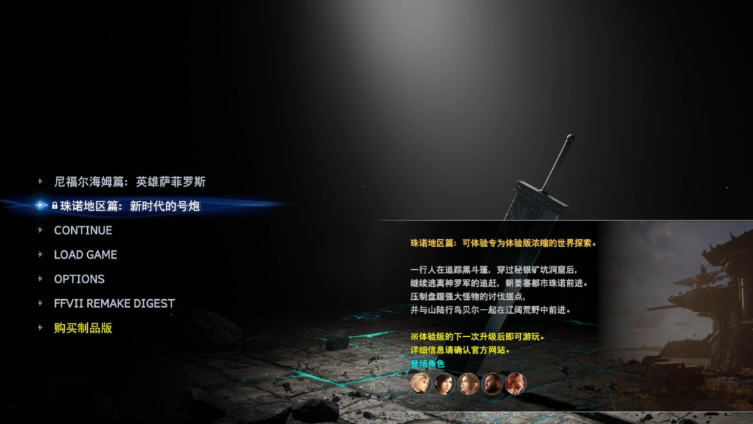 第二個章節-珠諾地區篇:新時代的號炮,目前處於鎖定狀態。據官方消息,將在2月21號解鎖。這個章節中,玩家能操作多位角色,包括蒂法、愛麗絲、真紅十三、巴雷特。玩家能在開放地圖中進行自由探索。