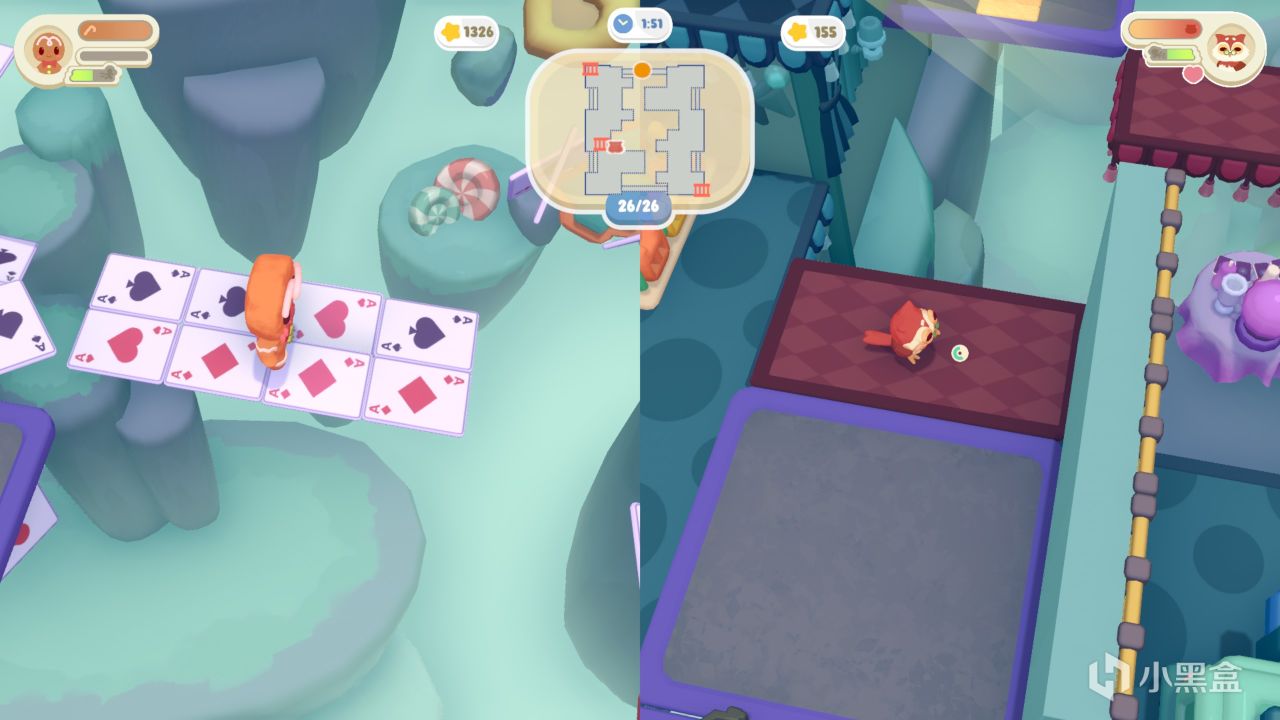 本次DEMO更新中除了開放聯機功能以外,還上線了兩個新地圖以及一個新角色。遊戲的地圖體現爲各種不同的主題公寓,豐富的交互要素也是讓玩家能在拆家博弈中感受更多樂趣。雖然兩個地圖「撲克天空城」和「魔術迴路廢墟」在元素稍有點同質化,不過某些地圖機關還是讓我產生了驚豔感:不僅多了許多移動道具加強了空間的利用,更是有一個把散落在空中的撲克牌自動鋪成一條路的有趣交互。