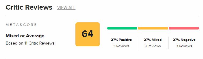 目前《碧海黑帆》的 M 站評分已經出爐,截止目前有11家媒體給出評價,其中3好評,3中評,3差評,2家待上傳分數,給出了 64 的均分。