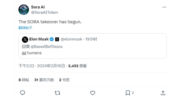 Sora發佈後,馬斯克用一句話點評:“gg人類(gg humans)。”gg爲Good Games縮寫,代指“打得好,我認輸” 。