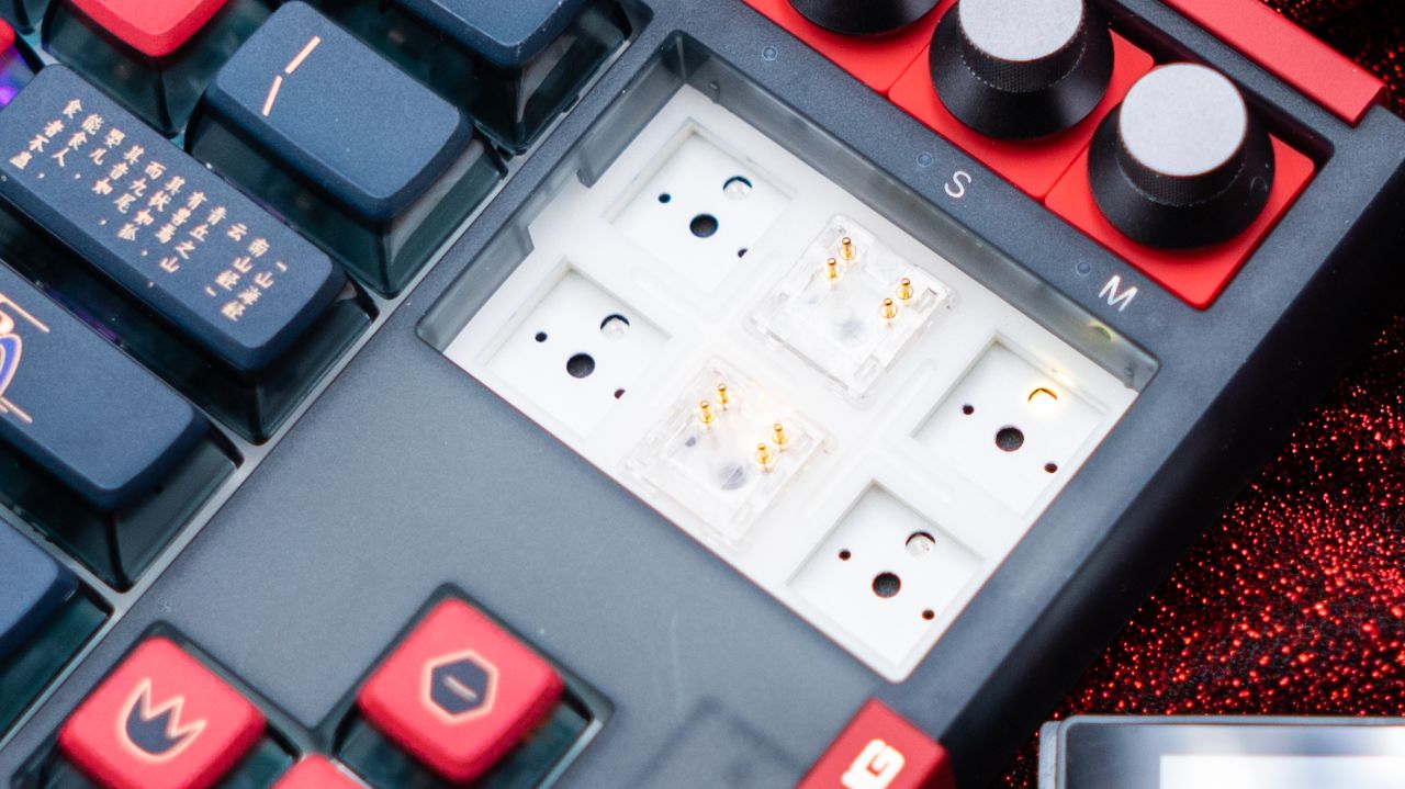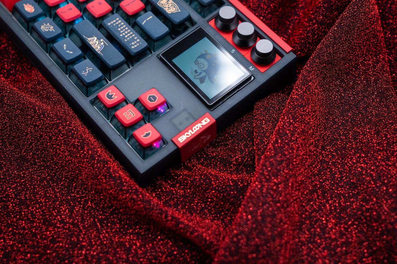 87配列的布局,采用红色主键盘区域+水墨蓝大键+黑色半透上盖的颜色搭配,红色的主键盘区域除了常规字母外还印有甲骨文,贴合国风键盘设计风格,键帽材质为PBT5面热升华键帽: