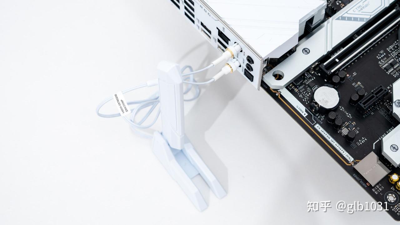 I/O 接口方面相比之前也有些变化,更多了两个USB 2.0接口,不过音频接口扩展少了。另外也注意到这次还有全新的易拆式天线,即插即用,还是白色涂装,与主板装甲配色一致。