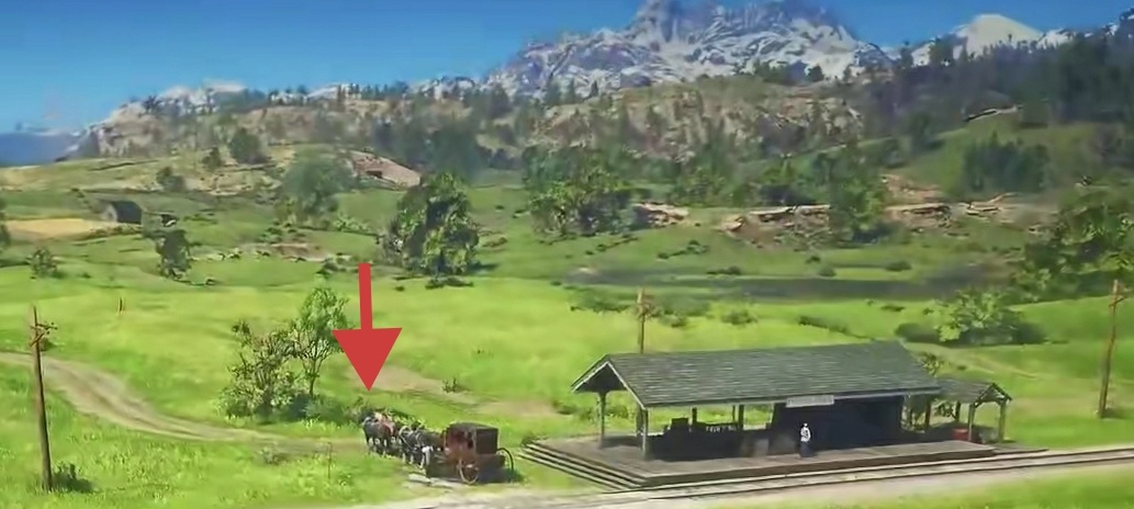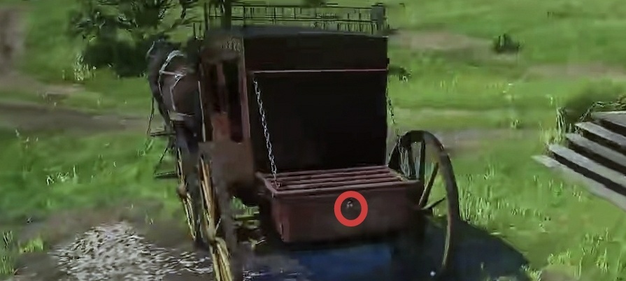 站在地圖上的避免通緝點位,翡翠牧場驛站馬車共有四匹拉車馬,開槍打左側前方的馬匹,馬伕聽見槍聲後會逃離,我們來到馬車跟前。