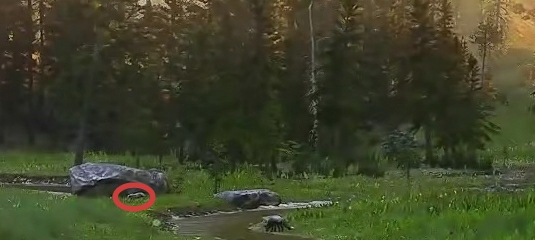 來到地圖此處,這裏有一頭大灰熊,一定要小心不要被它撲倒,用淬毒飛刀開死神之眼瞄準頭部擊殺即可。若求穩,可以先放食肉動物誘餌因它出來再殺掉。