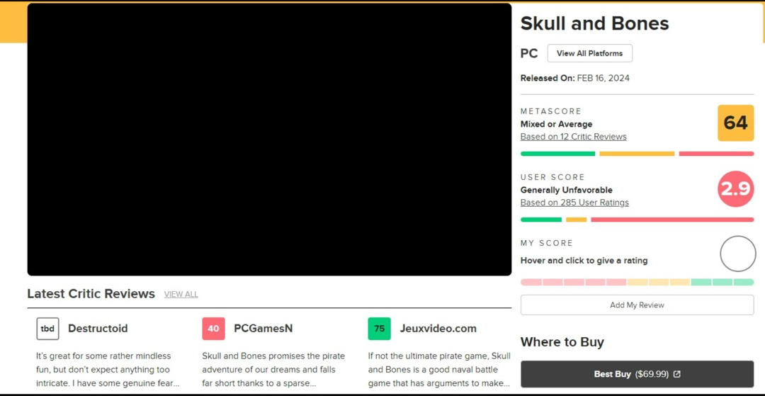 《碧海黑帆》在M站用戶評分中僅獲得了慘淡的2.9分,成爲今年至今評分最低的遊戲之一。玩家對該作的批評主要集中在玩法的乏味、終局內容的貧乏和無趣,以及對育碧先前將其宣傳爲“4A遊戲”的嘲諷。