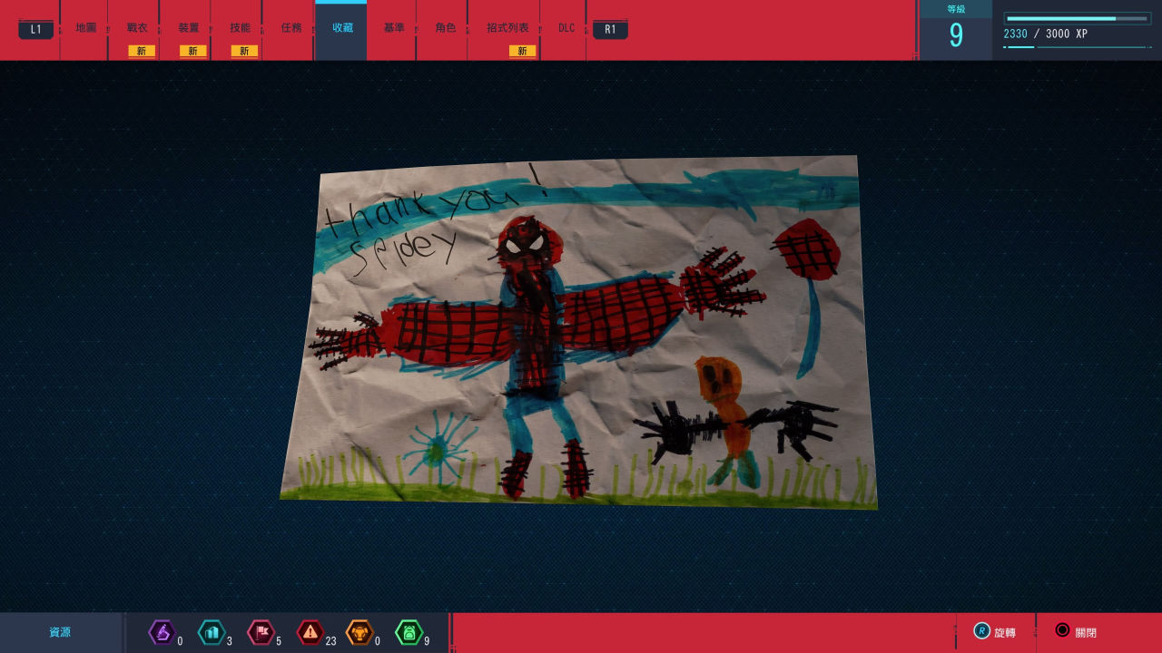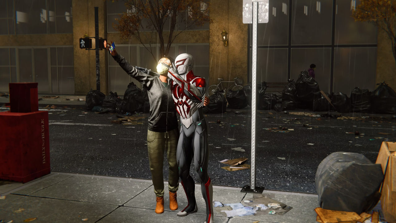 游戏的收集品也承担了一部分叙事的功能。城市的各处散落着各种过去八年间的小物件,与MJ第一次约会的菜单、某张蜘蛛侠的自拍等等,再附加上蜘蛛侠的嘴炮被动和有趣的台词,对于粉丝来讲也算得上是非常有趣。