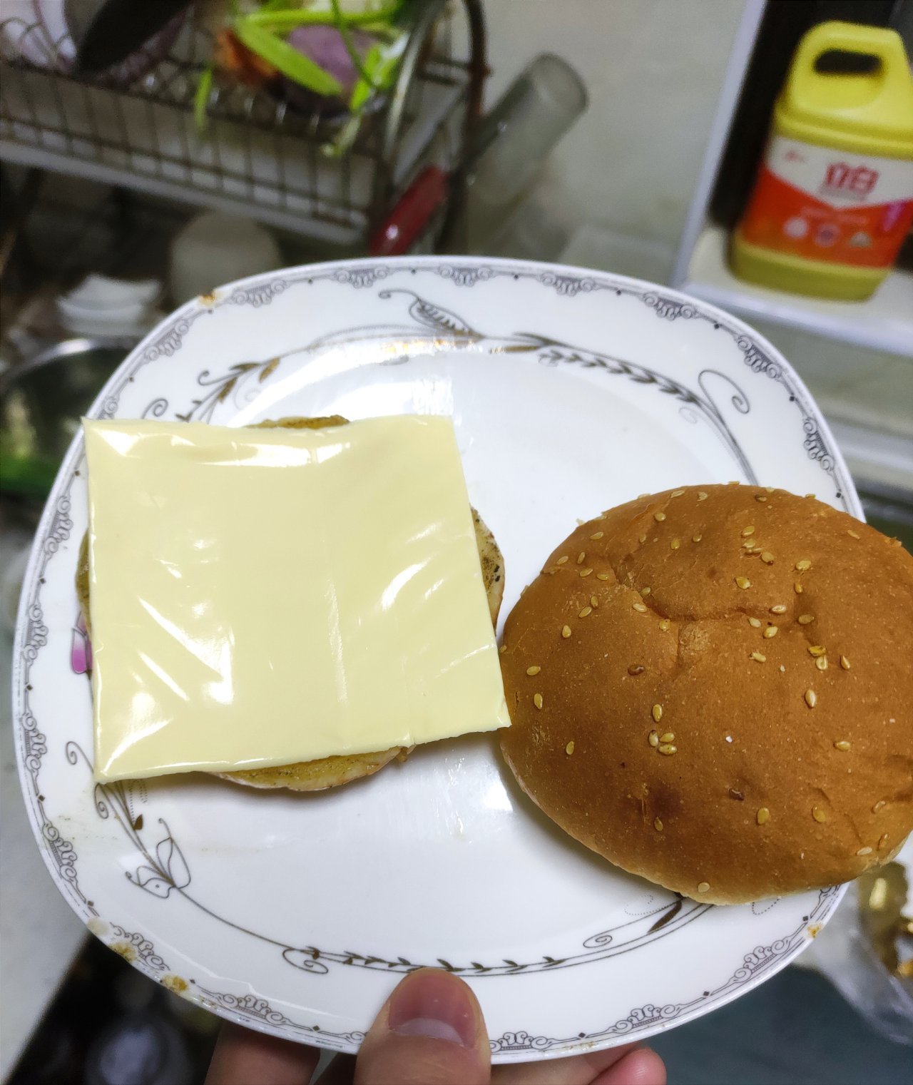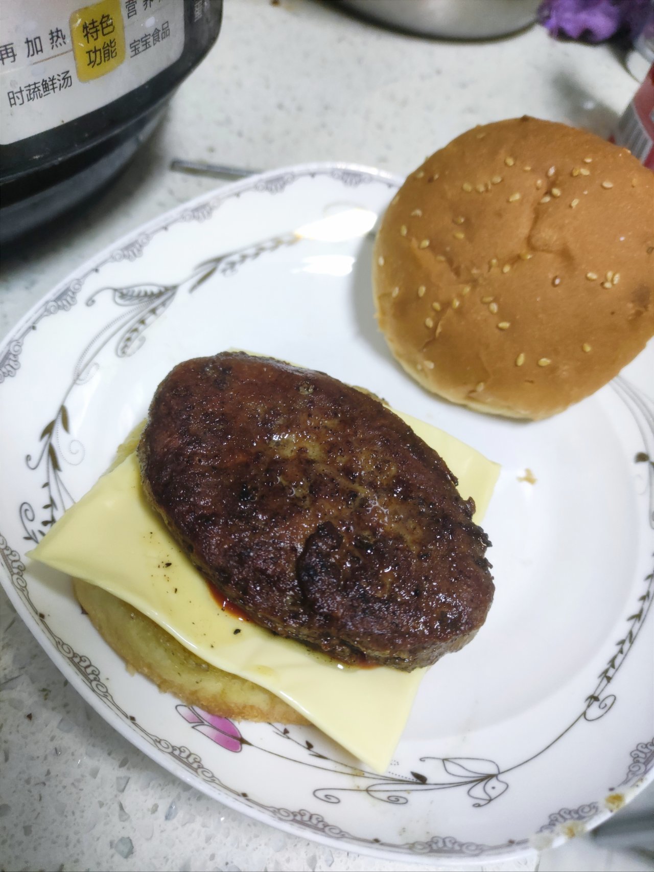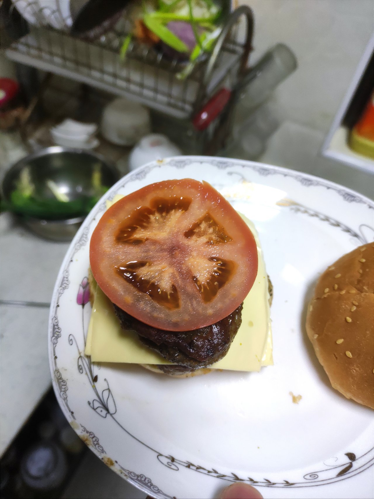 我这个牛肉饼不知道为什么煎着煎着就变成椭圆形的了,所以其实放不稳,样子就不好看
