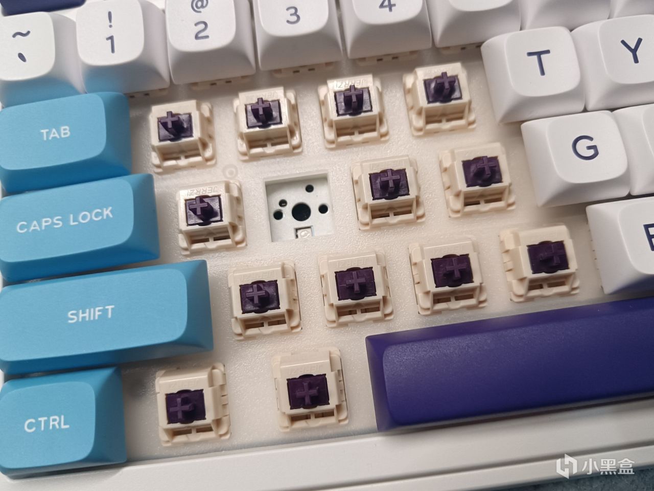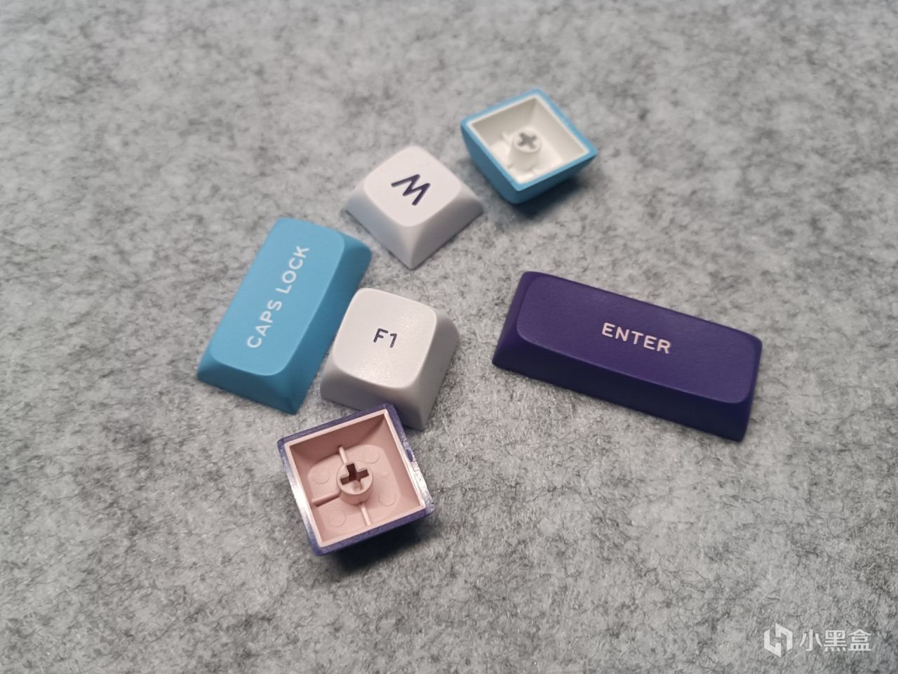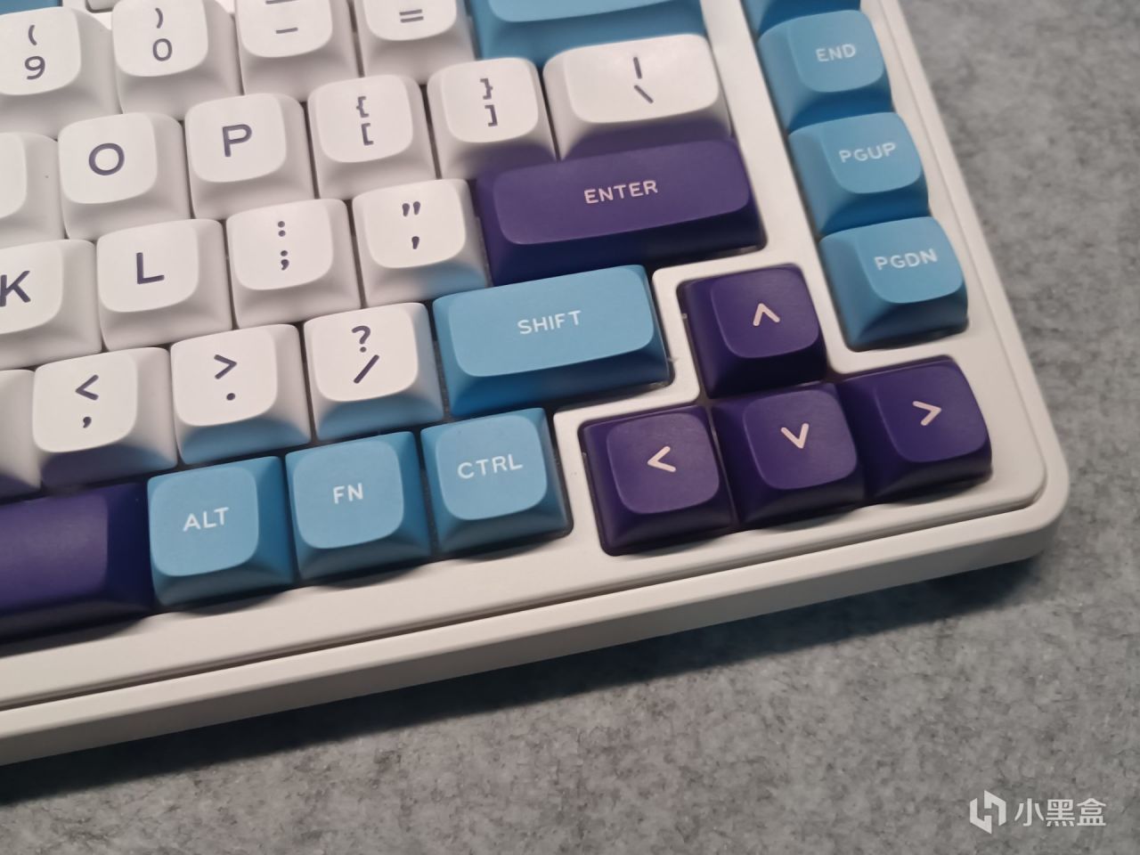 本次我选择的是与之前K68Pro相同的配色,碧蓝海,采用的是MDA高度球形键帽,白蓝紫三配色,PBT材质,不易打油,双色注塑工艺,闭口字符,字符更耐磨,触感顺滑细腻。