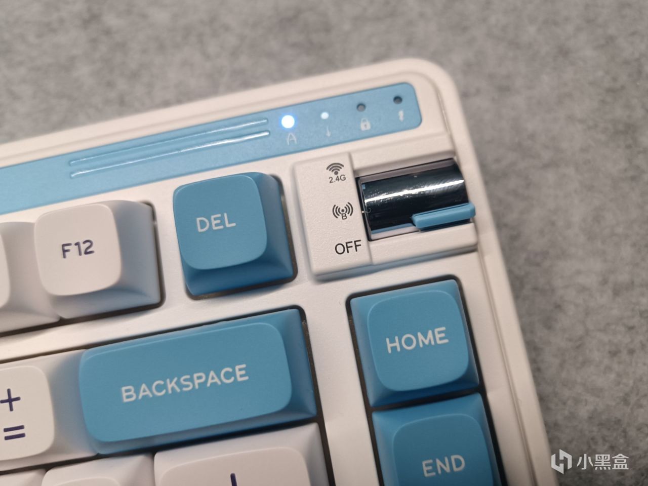 这把键盘右上角是布置了一个切换连接方式的旋钮开关,便于多个设备的切换,对于我来说是比较无感的,不过对于某些人是很棒的一个功能,之前K75系列熟悉的点阵电子屏也是没有了,相应的位置做了一块铭牌。
