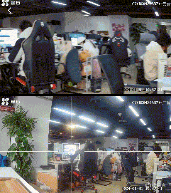 比較有意思的是,螢石C7還加入了好玩的多畫面聯動功能,比如“指哪看哪”功能,簡單說就是廣角鏡頭拍攝的大角度畫面,如果我們想看廣角鏡頭畫面中某個區域遠焦鏡頭更清晰的細節畫面,只需要點擊廣角鏡頭畫面中的特定區域,遠焦鏡頭就會旋轉雲臺調整拍攝角度,並自動聚焦拍攝選中區域,實際體驗下來,螢石C7的多畫面聯動功能非常靈敏,因此家裏當有看寵物、看小孩等需求,遠焦拍攝功能無疑會帶來更清晰的拍攝體驗。除此之外,螢石C7的聯動功能還支持智能追蹤功能,當固定鏡頭檢測到人形的時候,雲臺鏡頭會自動旋轉角度持續追蹤,相對傳統固定鏡頭攝像機而言,可以很好地規避拍攝死角的出現,實現雙攝像機的拍攝效果。