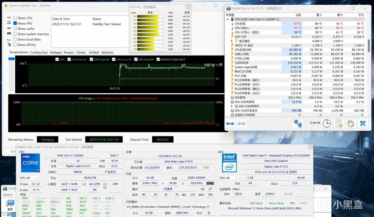 CPU频率 P核4.0 E核3.19GHz左右,温度97℃,功耗90W左右
