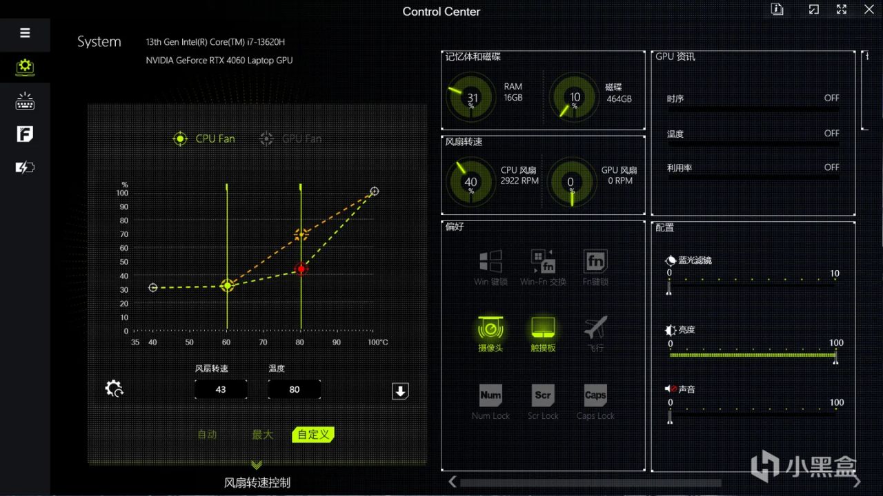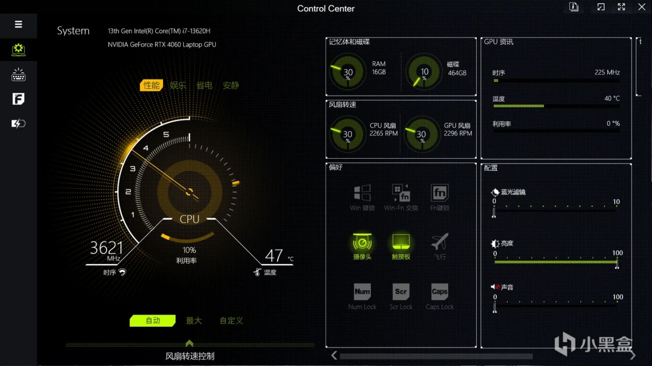 可调整设置运行模式(安静 省电 娱乐 性能),可设置开启独显直连,自定义风扇转速策略和键盘RGB灯效,调节屏幕亮度和声音大小。