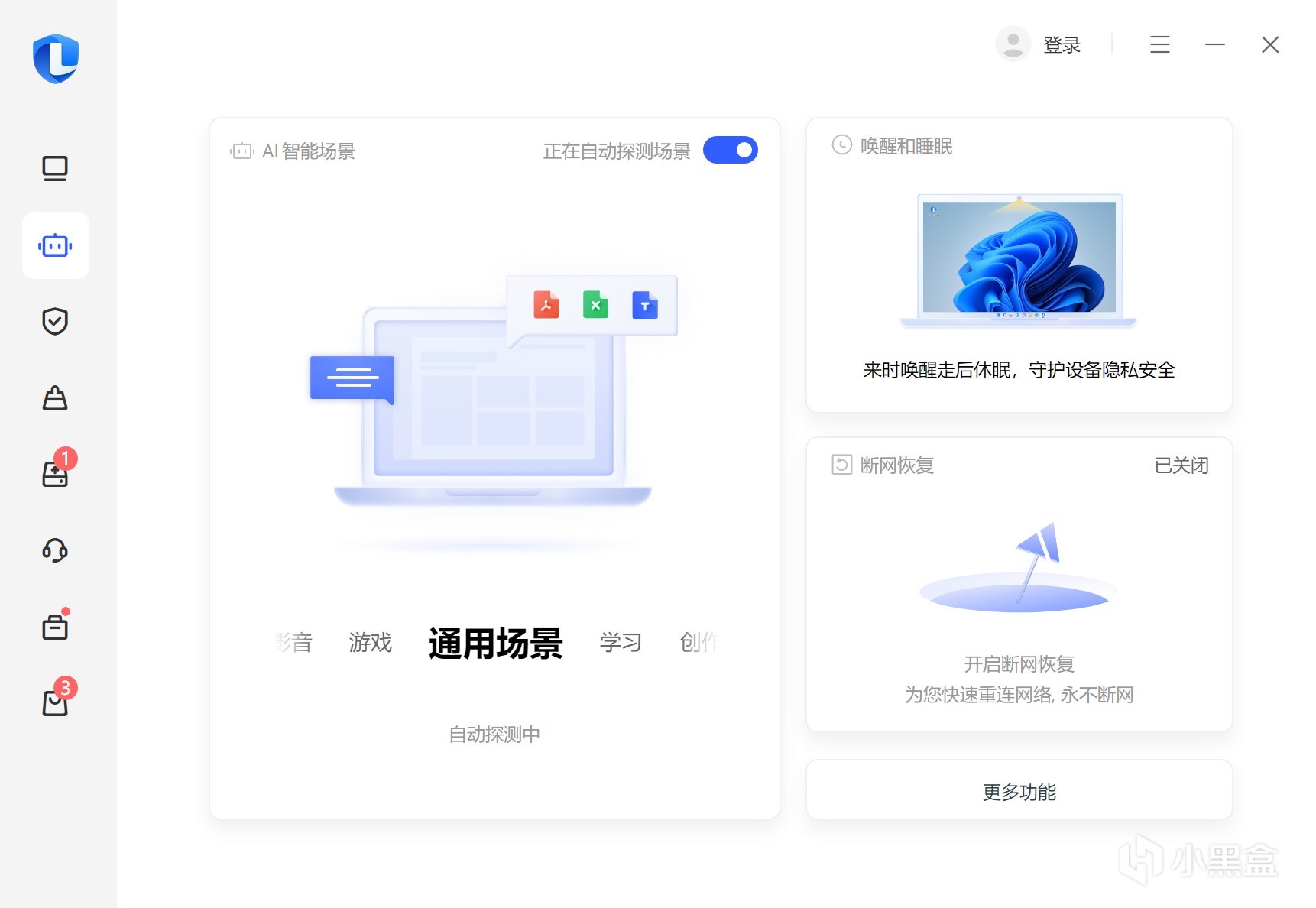 这次小新Pro14取消了联想智能引擎,把场景识别切换整合进了联想电脑管家里。一个软件管全部,这个思路很人性化。除了AI智能场景切换,还有人走休眠和断网恢复等实用小功能。很多时候,