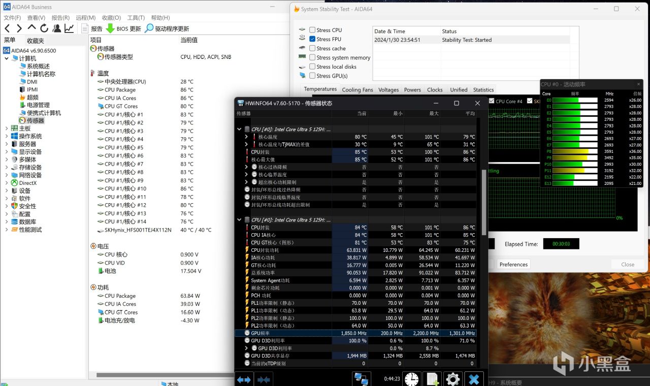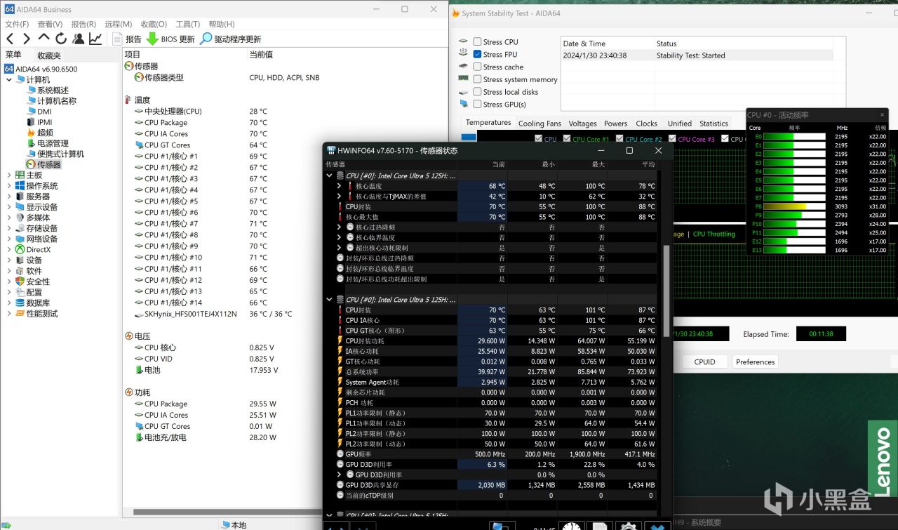 在野兽模式下,单烤Stress FPU的功耗为64W,大核心频率为4.2GHz,小核心频率为2.7GHz,LP小核频率为2.4GHz这个性能释放在轻薄本里已经算是非常强的了,并且可以把U5的4个大核顶到4.2GHz,接近最大睿频。CPU层面基本没啥压力了。