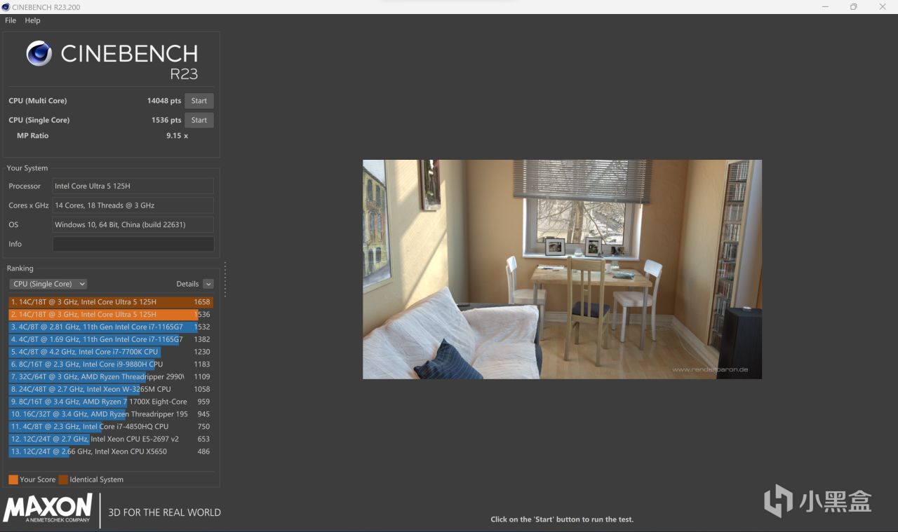 用电池的R23,有14048PTS的多核。1536PTS的单核。