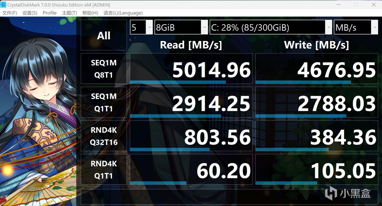 CDM跑下来5014的顺序读取,4676的顺序写入,Q32T16 4K 803读取,384写入,Q1T1 4K 60读取,105写入