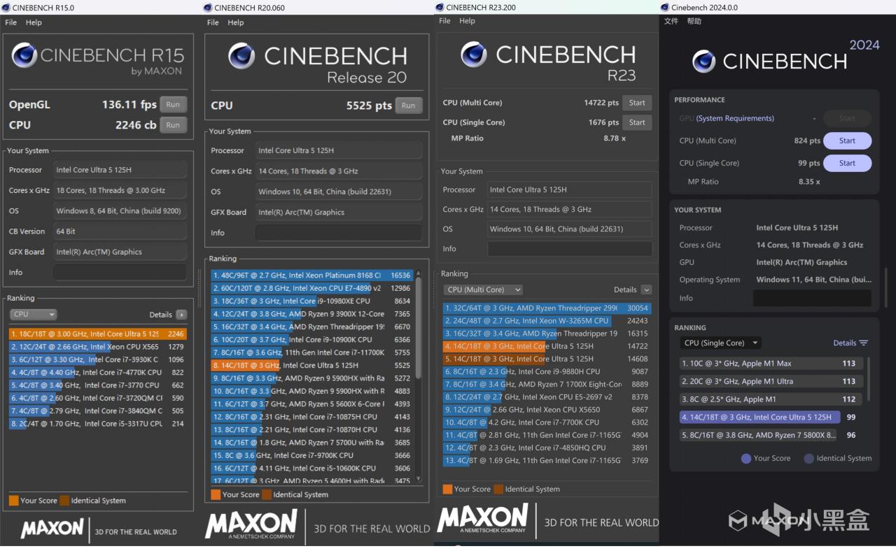 - 在R22024中,CPU有824PTS的多核。99PTS的单核
