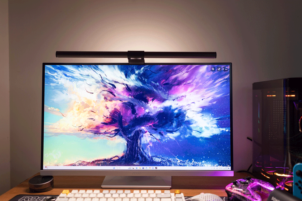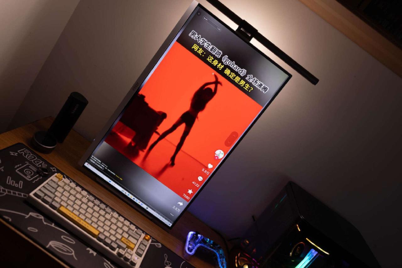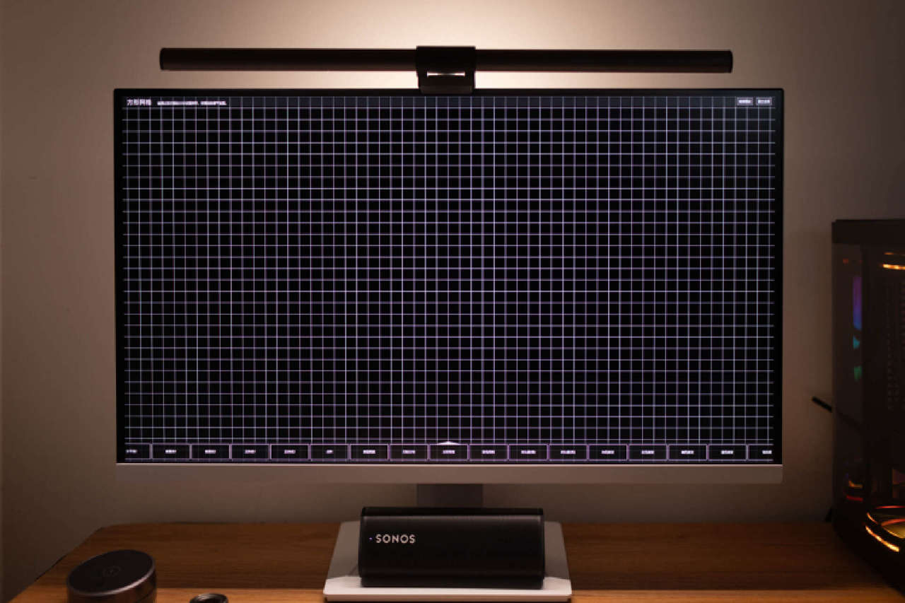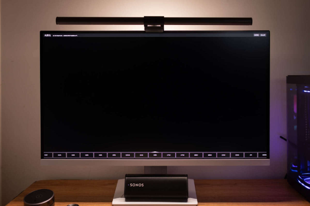 平整的显示器底座,也能让你轻松摆放桌面工具或者数码设备。我这里就布置了一个蓝牙音箱,就个人而言,相比那种浮夸的电竞支架造型,我更喜欢这样简洁的设计,实用性非常不错。