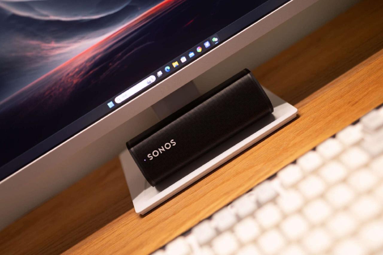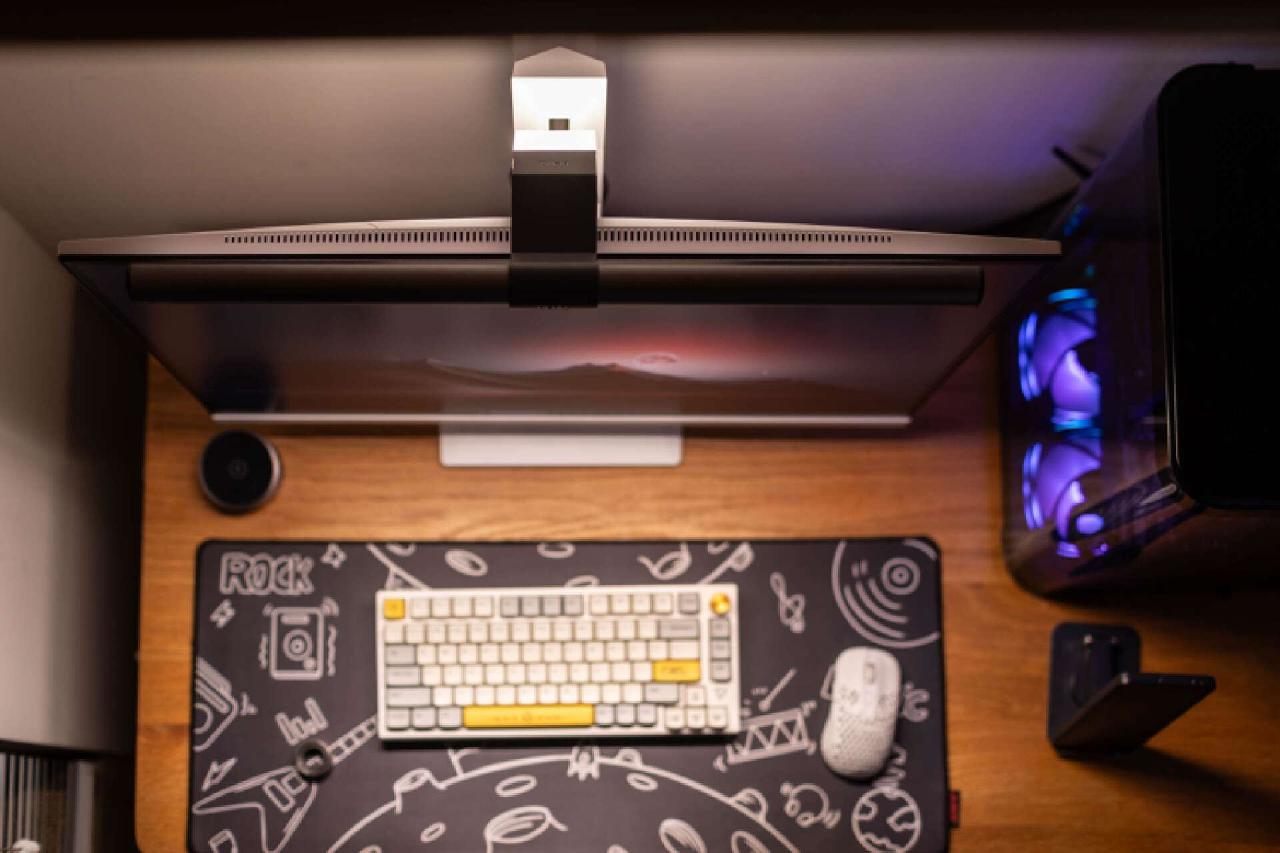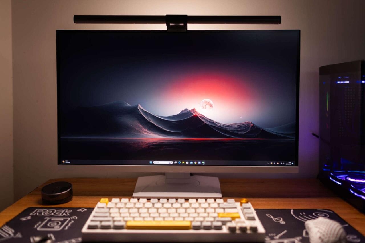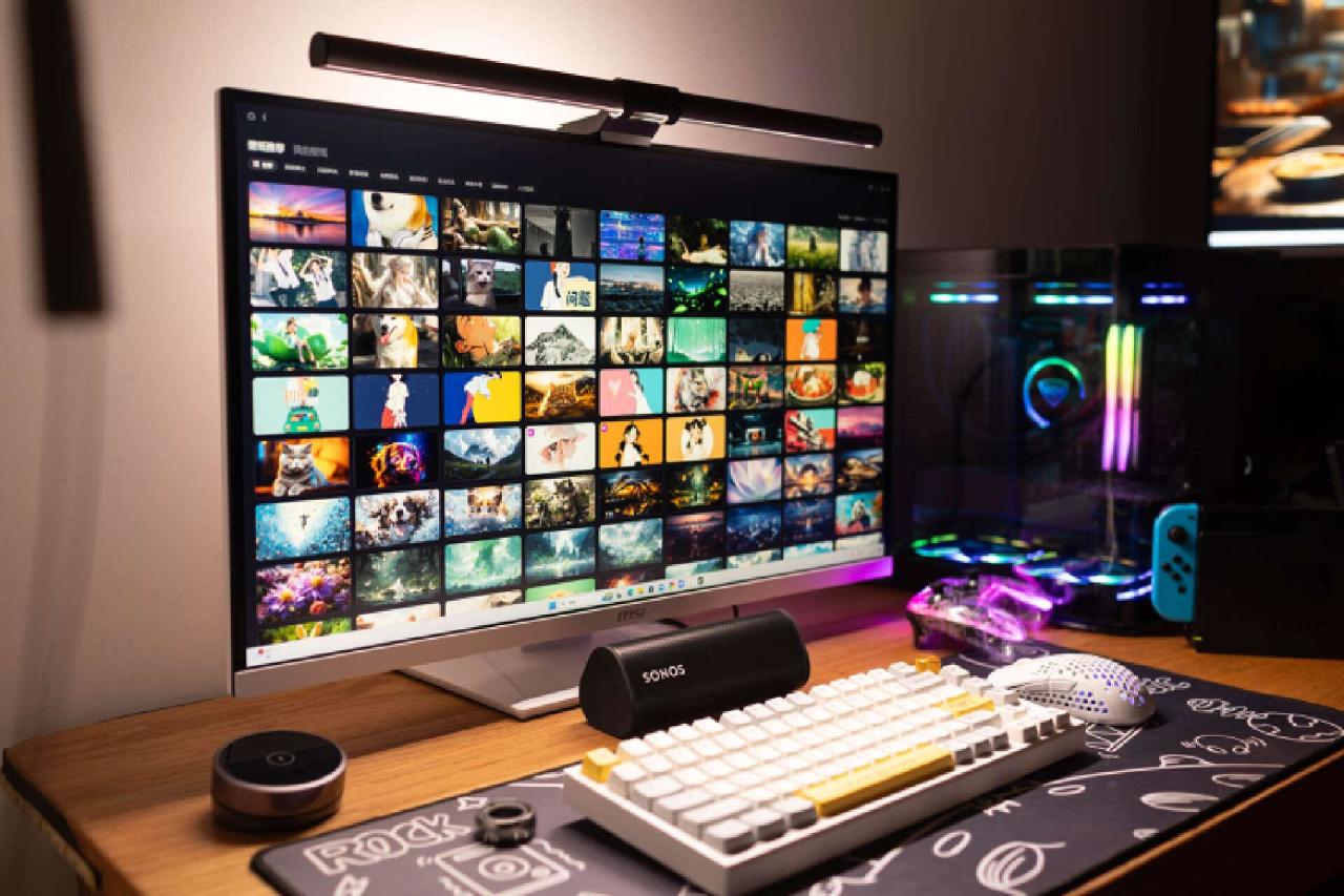 平整的显示器底座,也能让你轻松摆放桌面工具或者数码设备。我这里就布置了一个蓝牙音箱,就个人而言,相比那种浮夸的电竞支架造型,我更喜欢这样简洁的设计,实用性非常不错。