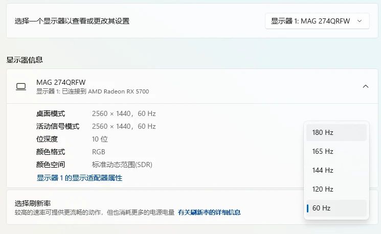 微星MAG 274QRFW在DP数据线连接的情况下,可以开启10bit色深和180Hz刷新率,配合2560*1440的2K分辨率,电竞属性可谓是直接拉满,各类游戏都能轻松应对。