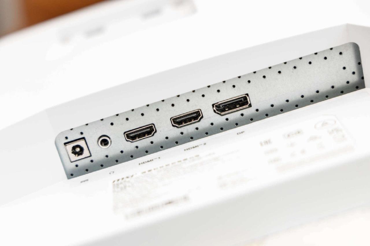输入接口方面,显示器提供了2个HDMI2.0B,1个1.4 DP接口,1个3.5mm音频接口和1个外置DC电源接口。