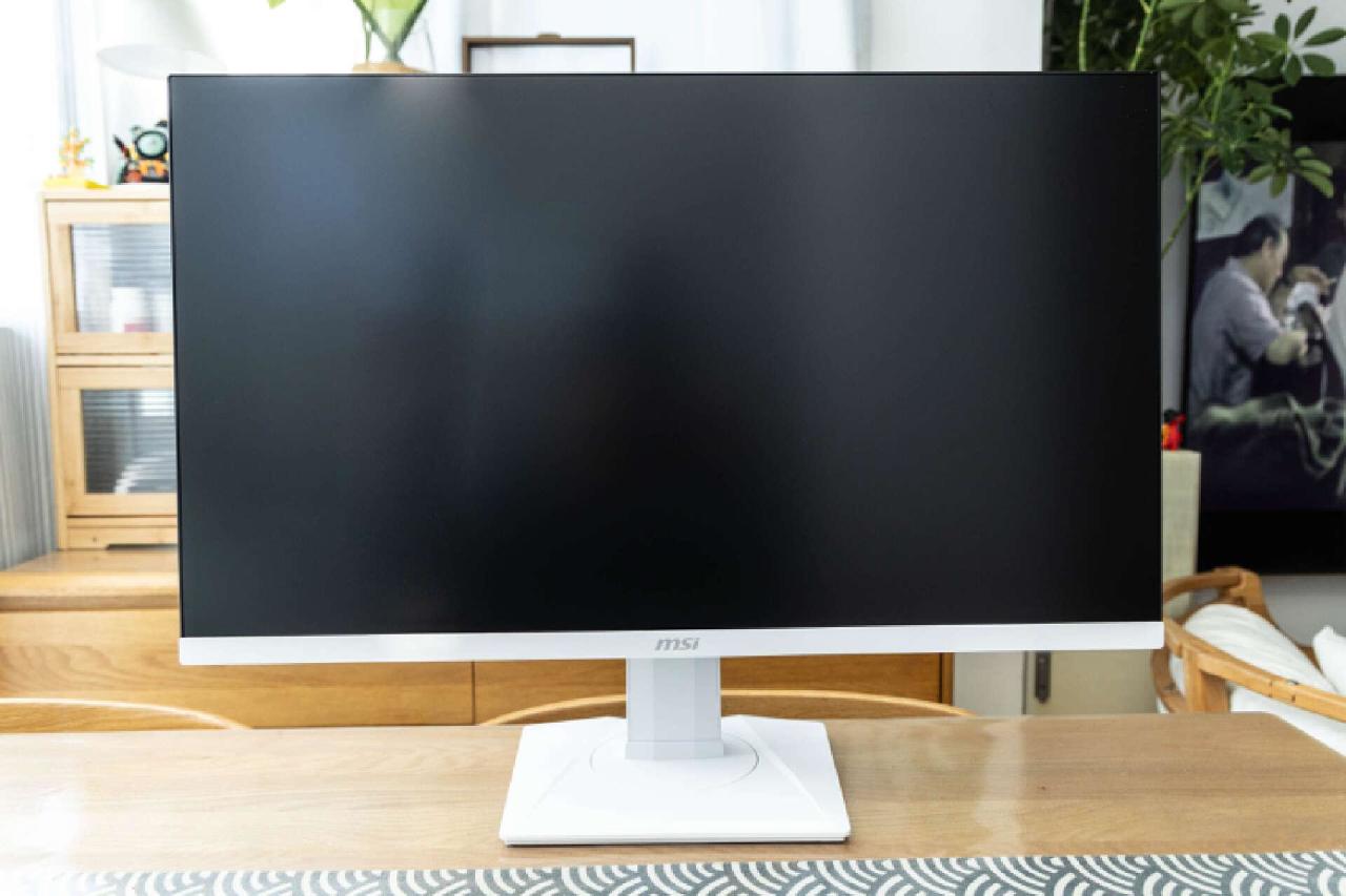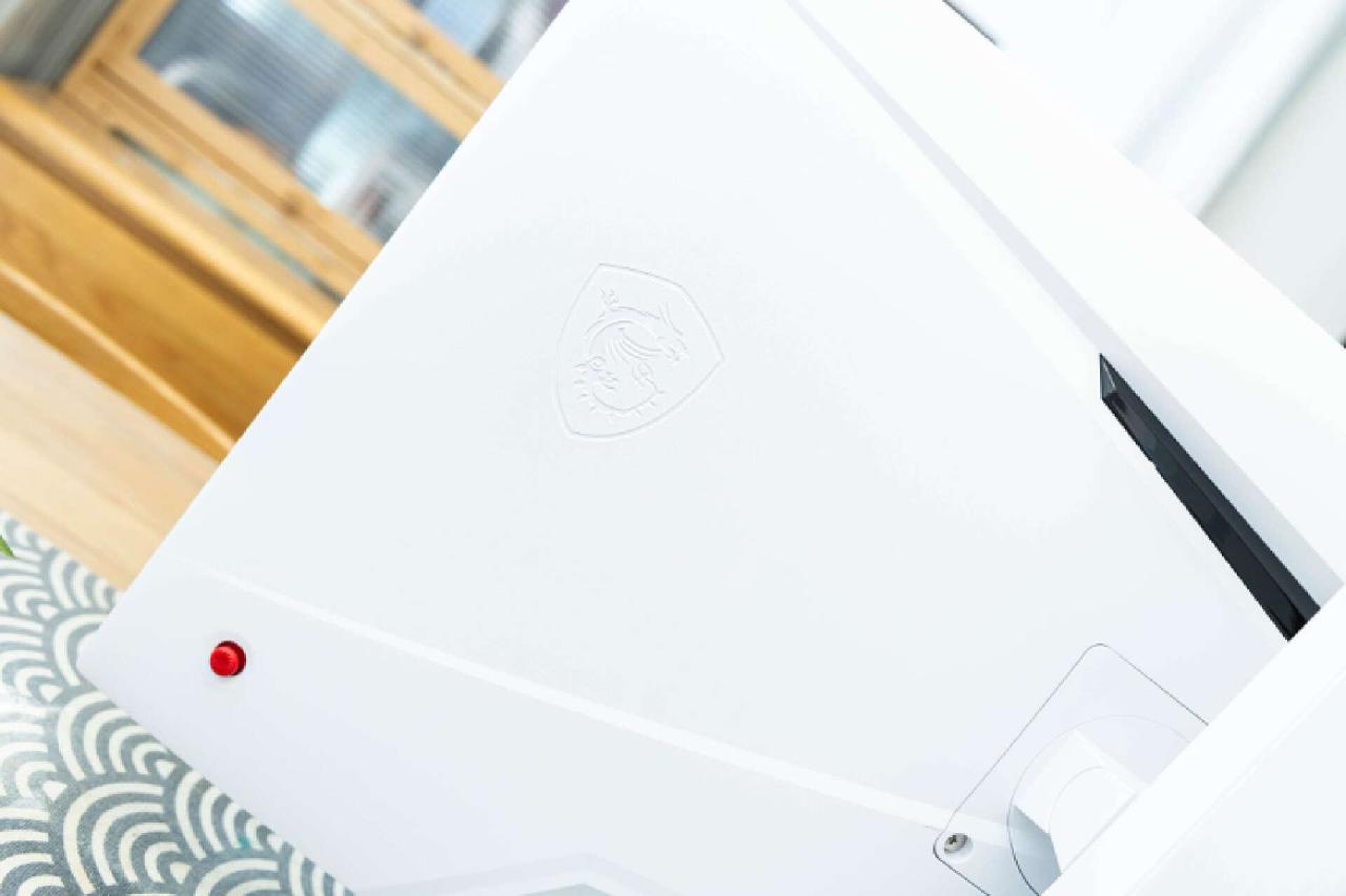 显示屏三面窄边框设计,屏幕下边框中间可以看到醒目的MSI标识,配合纯白机身整体风格稳重中带有优雅。