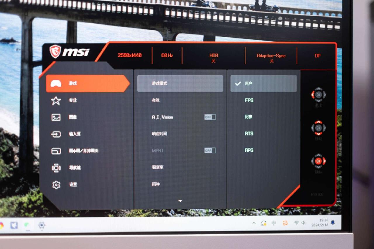 配合摇杆使用时,通过上下左右的调节,不仅操作逻辑直观,还能调出相应的快捷菜单。快捷菜单还能在设置菜单中进行自定义设置。作为电竞显示器,MSI还为这款显示器增加了物理瞄准镜,计时器等物理外挂。