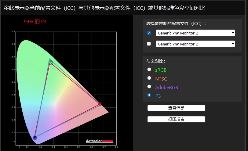 实测到这款显示器的P3色域达到了94%,略低于官方95% DCI-P3数据,但是考虑到测试环境和实验室的差距,还是可以接受的。