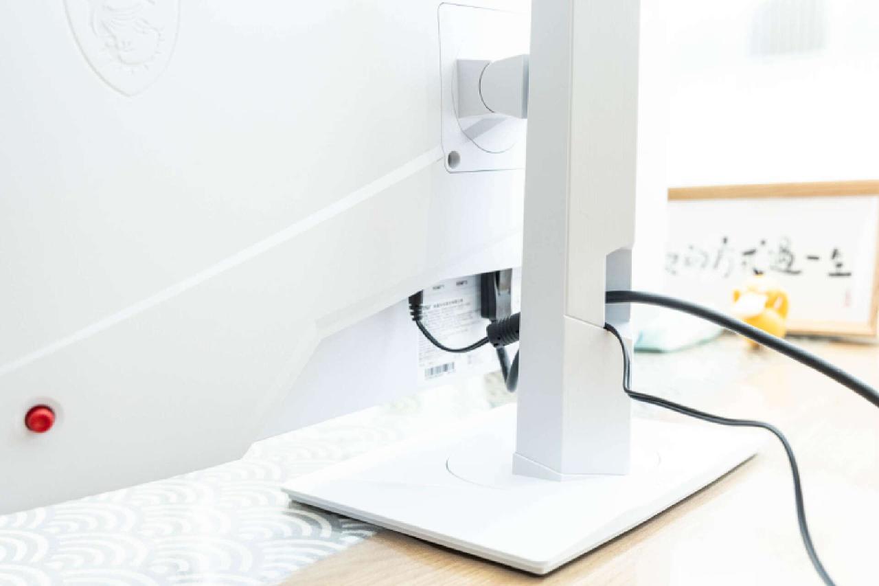 显示器的支架还提供了大口径的导线槽,各类数据线都能快速有效整理。日常使用显示器时通过适当调低屏幕高度,可以完美隐藏所有线束。