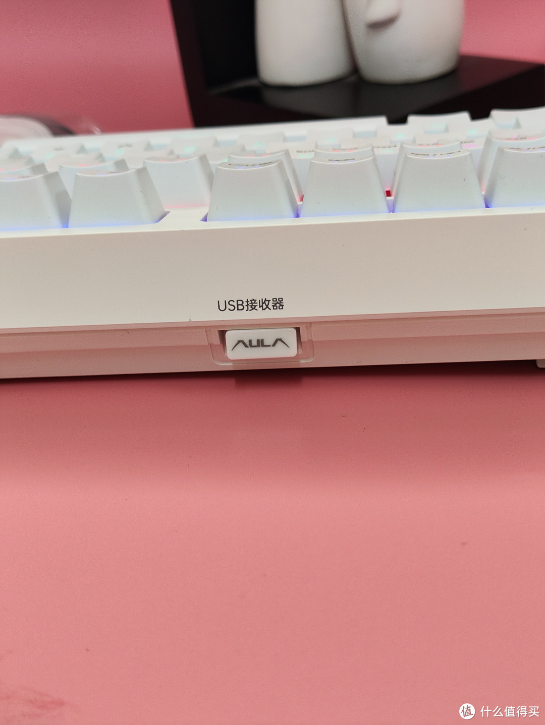 键盘顶部有个小接口,放这接收器,体积比较小巧。