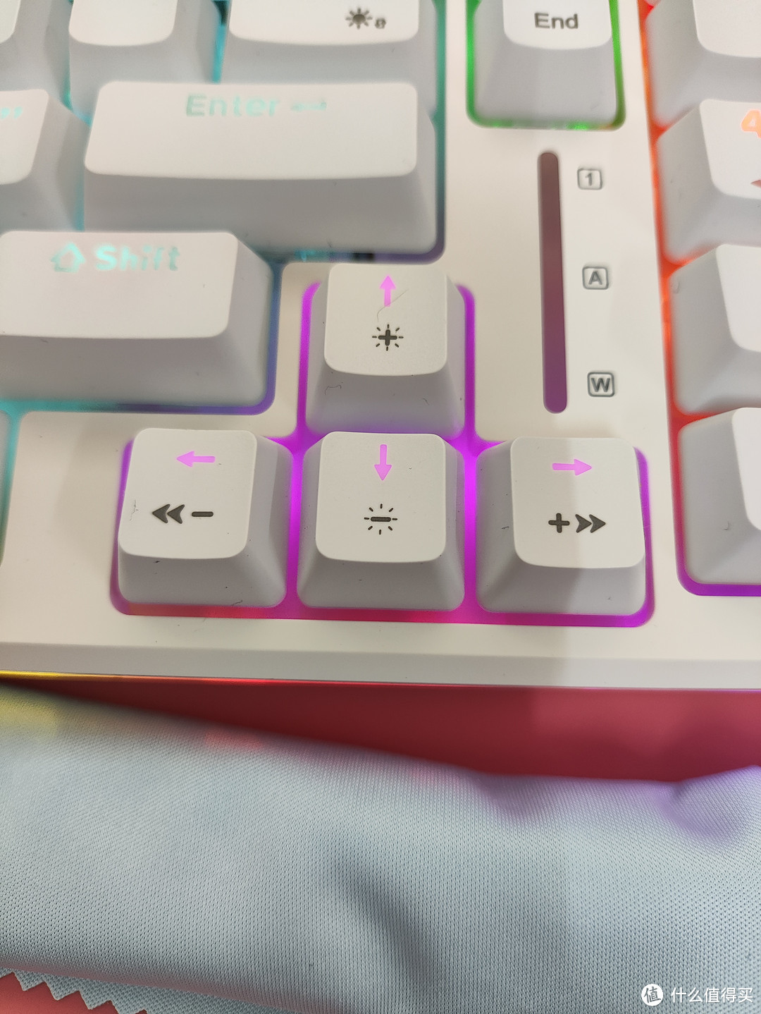 方向键上面有个灯条,显示的数字键盘的状态,大小写的状态,还有一个W的不知道是显示什么的。如果是大写字母的状态,就会亮灯。反之就不会亮灯。