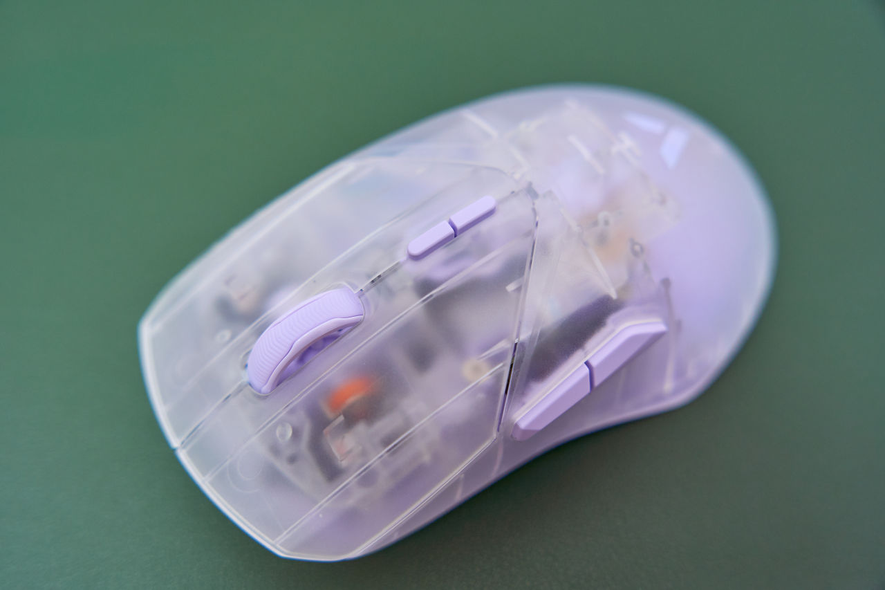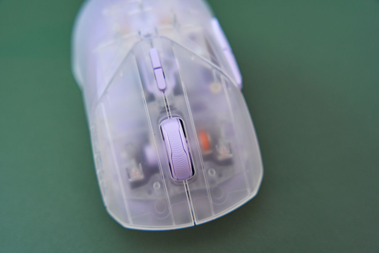 鼠标左右键也是透明外壳,加大加宽按键面积覆盖到鼠标中部,这对于各种握法都有很强兼容性,任随玩家找到合适自己的姿态。左右键仍然采用了欧姆龙6000万次寿命的微动和雷柏自研的C+click分离式按键预压校调,按压触发手感一致,回弹反馈清脆无空腔音。