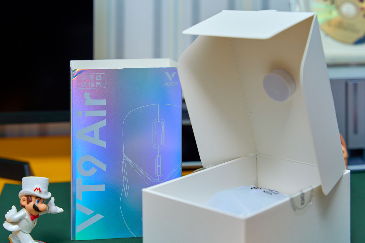 破开防拆贴,VT9Air仍然套着塑料膜端坐其中。在内盒顶上,专门有圆柱体减震海绵用来压紧鼠标本体避免运输过程中的撞击、划痕,这细节设计在VT9初代就有了,坚持到现在必须点赞。