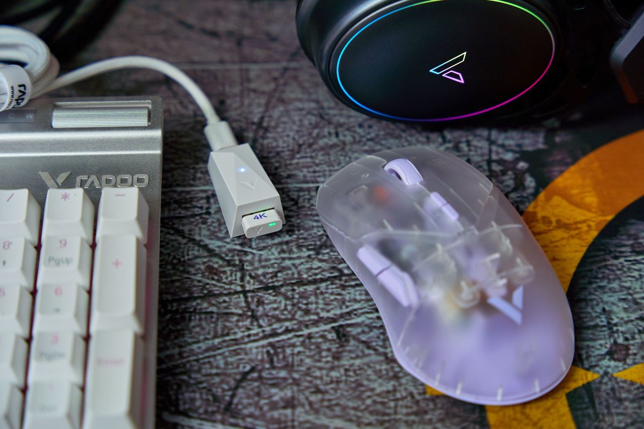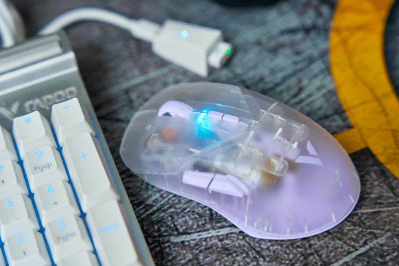 伞绳编织线、转接器配上VT9 Air的Nano接收器放在桌面意外的好看,鼠标开机自动配对后接收器常亮绿色状态灯,科幻机甲的小味道一下子就上来了。