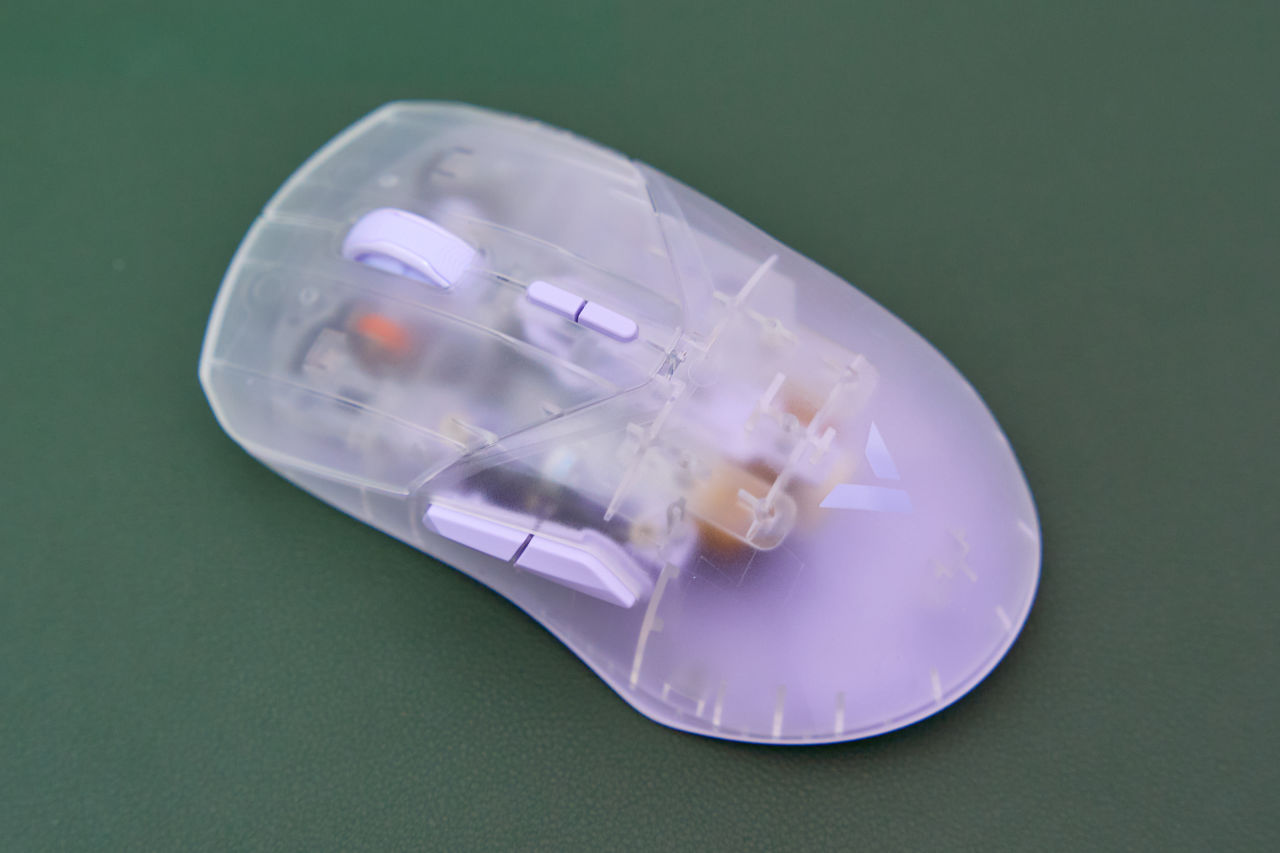 我入手这款VT9Air是“星霜”配色,一种特调过的淡紫色透明外壳。VT9Air仍然延续着系列样式,左右对称外观。鼠标尺寸方面与VT9其他兄弟相比消瘦一点点,体积压减到了120×65.7×37.5mm。