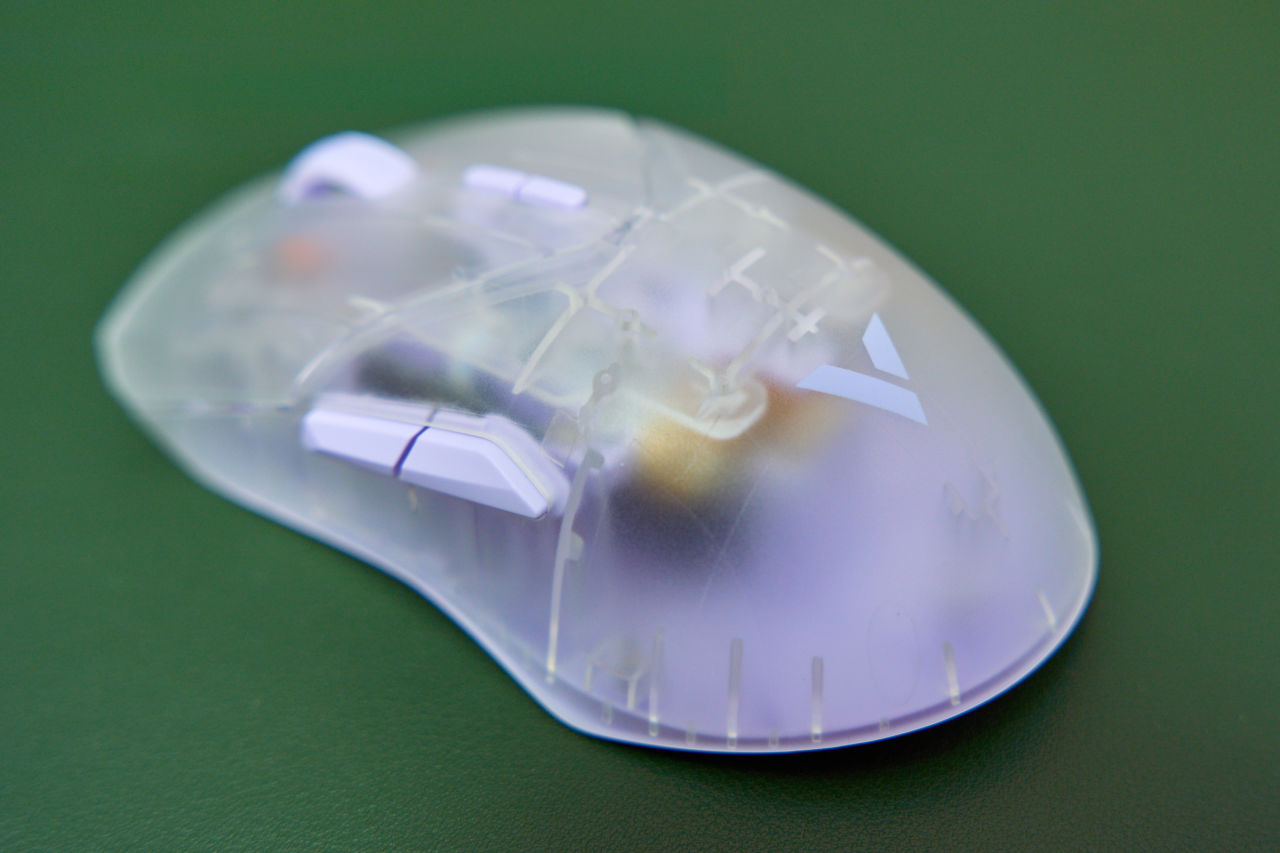 半透明外壳可以看到内里结构,磨砂表面又让人看不清零件,但是机身壳体上的加强筋清晰分明,科幻与机械融合的味道挺浓,雷柏“V”字logo印在鼠标后背隆起处。