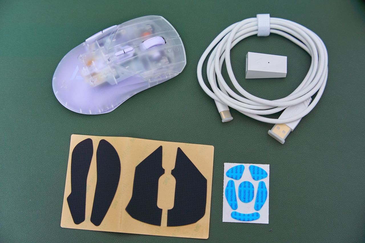 除了鼠标本体,还附带有白色伞绳编织的电源数据线、USB to Type-C转接器,还给了备用脚贴和黑色的防滑贴。防滑贴有4片,分别针对左键、右键和2个侧裙做了针对性裁切。