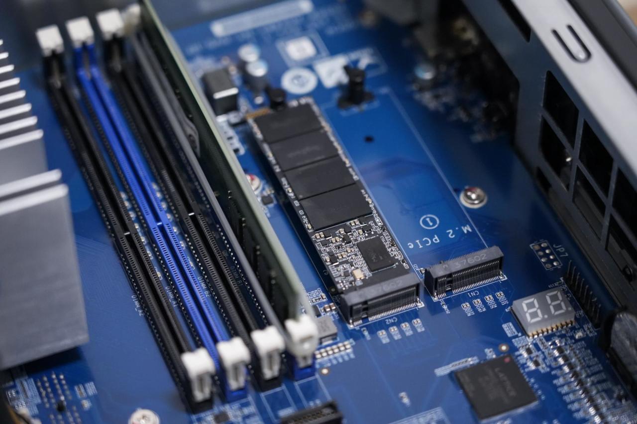 此外,拆开NAS查看内部,可以看到4个 U-DIMM DDR4内存插槽,还支持 ECC 内存。在内存区域旁边还拥有2条PCIe3.0*4(4GB/s)的M.2 2280 NVMe SSD插槽,关键是官网产品介绍中竟然未提及这两个NVMe SSD插槽,赚大发了。
