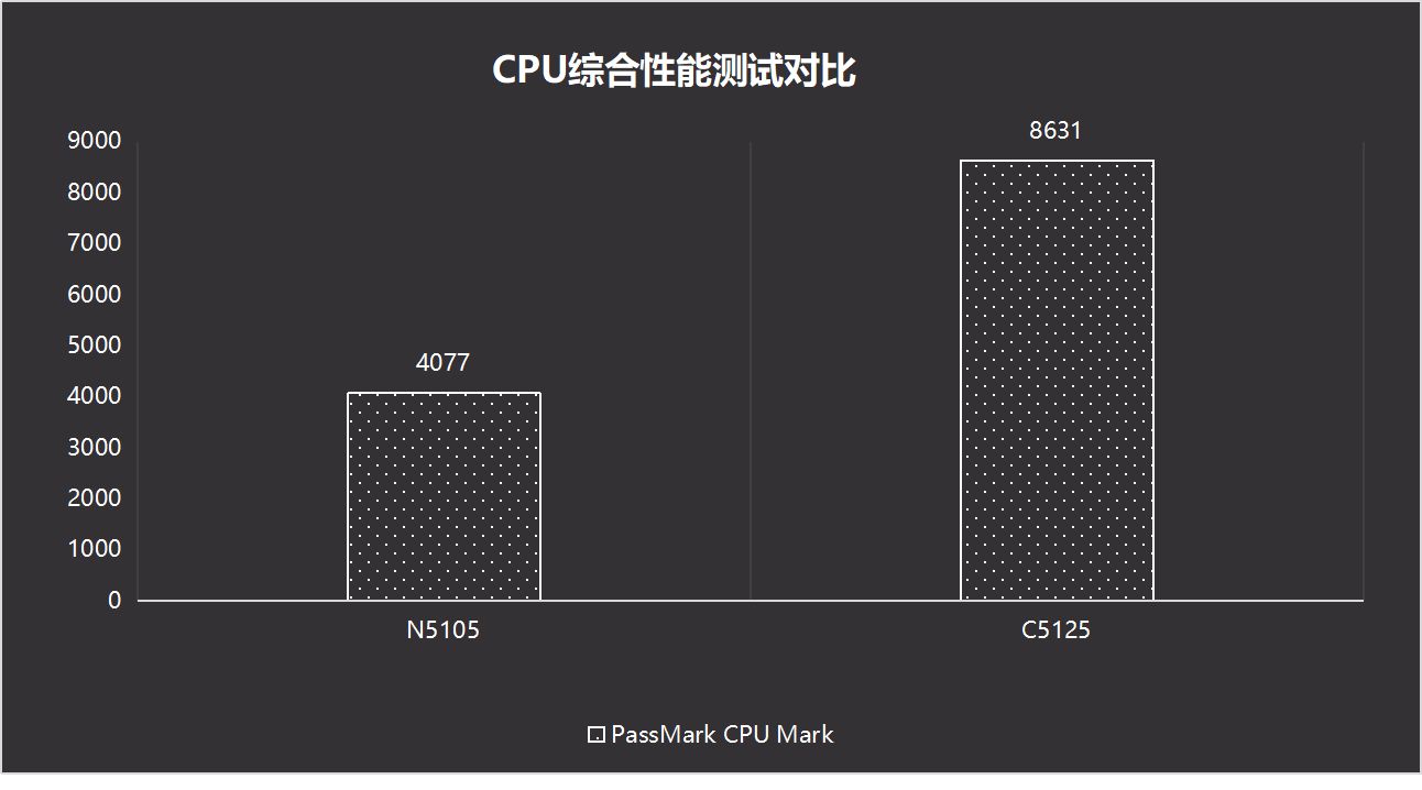 可以看到在PassMark CPU Mark的综合性能测试中,Intel Atom C5125的性能已经是N5105的2倍还多了。