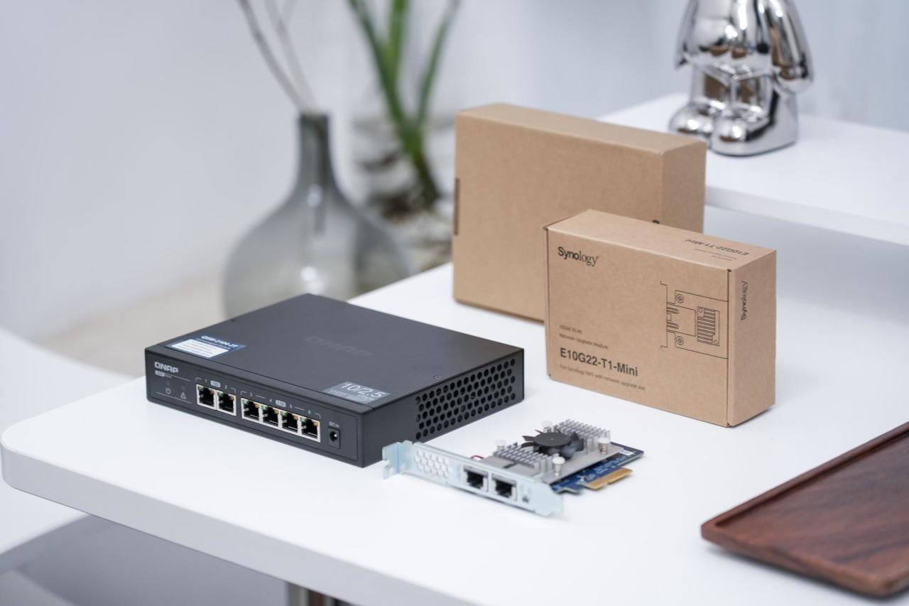个人在家中还在使用威联通QSW-2104-2T万兆交换机,有3张万兆网卡分别是威联通PCIe双万兆网卡QXG-10G2T-X710,群晖万兆网卡E10G22-T1-Mini,以及华硕万兆网卡XG-C100C,搭配下来轻松组成万兆环境。