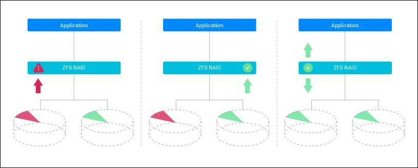数据完整性 (Data Integrity) 是确保应用程序和数据库正常运作的基础之一,尤其当前企业采用 SSD 的比率高速攀升,而 SSD 一旦故障,数据随即丢失。ZFS 具备预防静态数据损毁 (Silent Data Corruption) 的自我修复能力 (Self-healing),可针对所有数据区块进行 Checksum 校验,并自动修复错误的区块。如因发现硬件 (例如:破损的传输线)、驱动程序、或 Metadata 出错而导致的静态数据损毁,下次读取此区块时,会因发现 Checksum 结果不一致而利用备份数据自动修复,确保数据完整而正确。