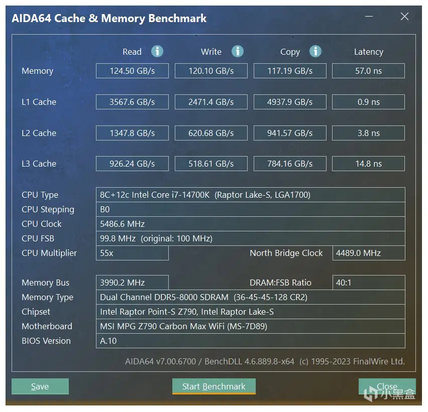 内存的读取速度为124500MB/s,写入速度为120100MB/s,复制速度为117190MB/s,延迟为57ns。